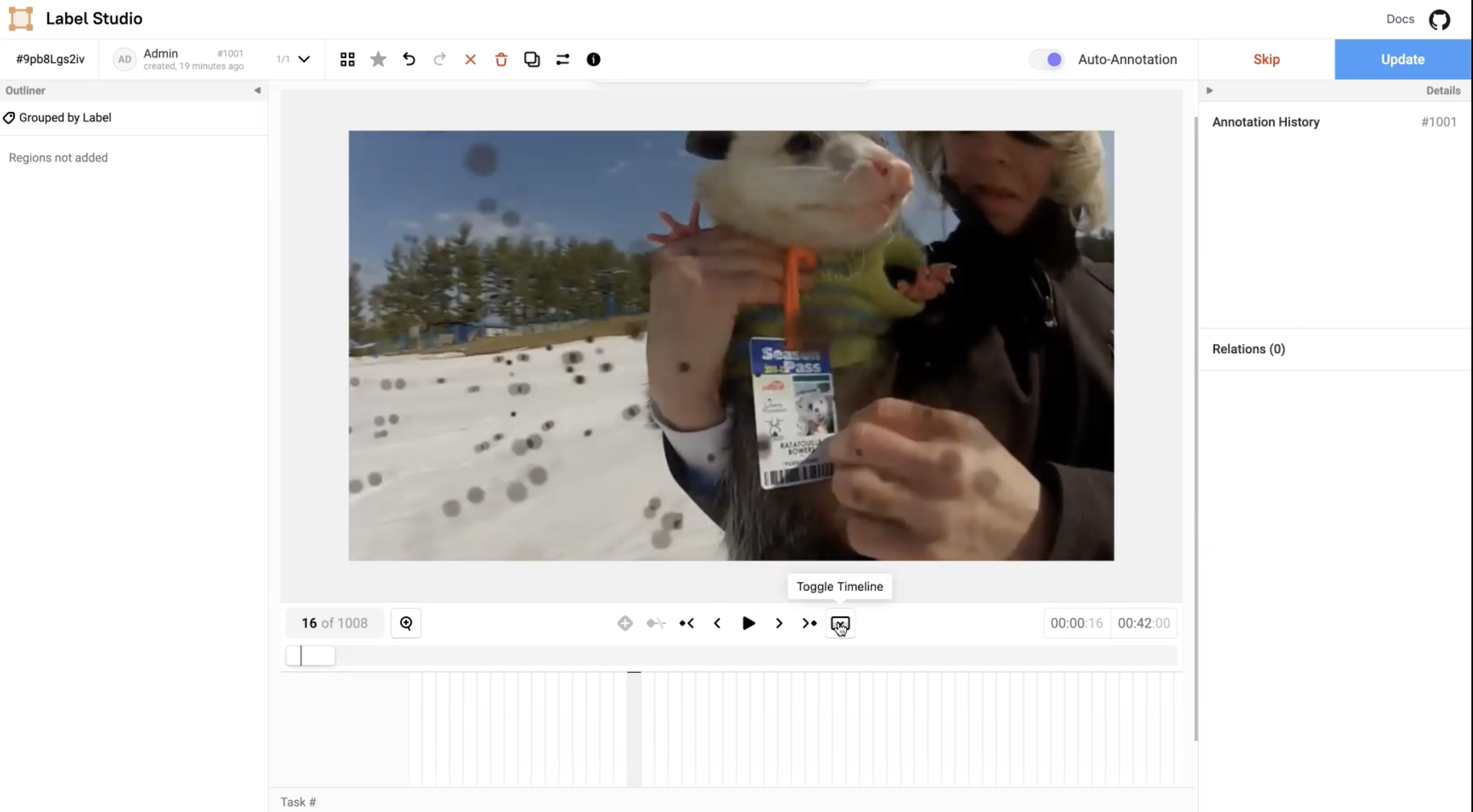 You can reconfigure the annotation workspaces to simplify labeling larger tasks, including large images and longer videos with many regions. This allows you to view more of the video portion, a wider space for the timeline, and the ability to see many keyframes and regions.